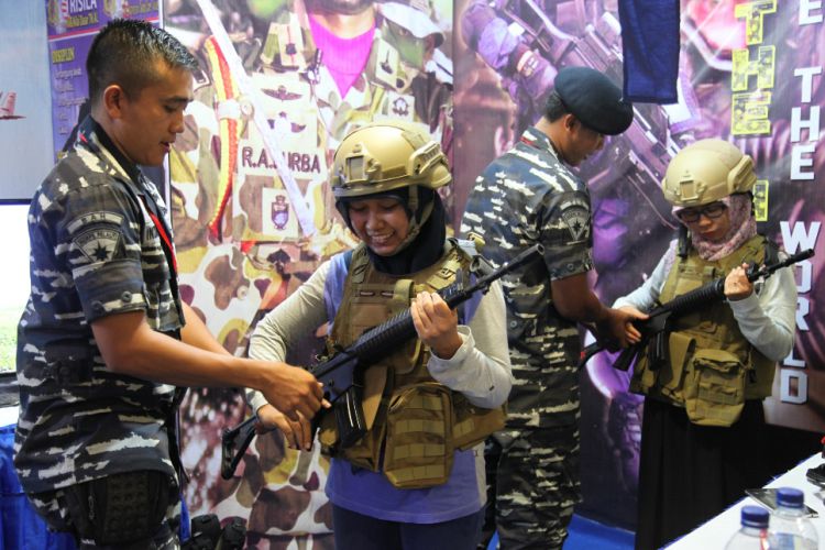 Dua orang wanita ini mencoba mengenakan pakaian rompi dan senjata, yang mendapat bimbingan petugas TNI AL di lokasi PRK Expo memperingati HUT Kutim ke-17. ©2016 Merdeka.com