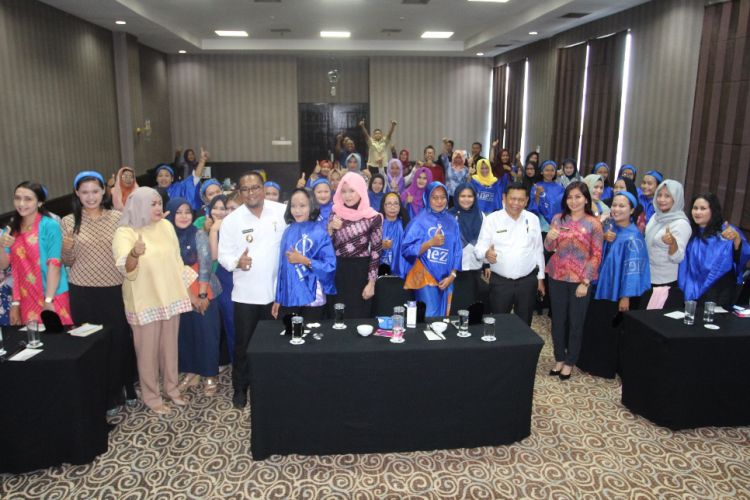 Wabup Kasmidi Bulang berfoto bersama dengan peserta pelatihan make up usai membuka acara tersebut di Hotel Victoria, Sangatta Utara. ©2016 Merdeka.com