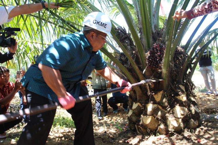 Bupati Ismunandar ketika melakukan panen kelapa sawit perdana milik Gapoktan di kecamatan Telen. ©2017 Merdeka.com