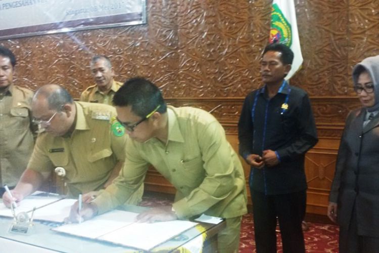 Bupati Ismunandar dan Ketua DPRD Mahyunadi menandatangani berita acara persetujuan tiga buah Raperda menjadi Perda oleh DPRD Kutim. ©2017 Merdeka.com