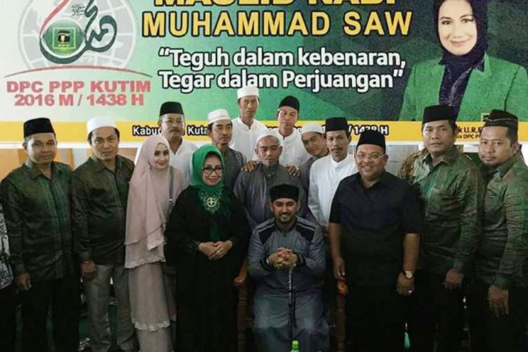 Ketua DPC PPP Kutim Encek UR Firgasih dan bupati Kutim Ismunandar berfoto bersama dengan ustadz Habib Ahmad Al-Habsyi bersama pengurus PPP Bengalon, usai acara peringatan Maulid Nabi Muhammad. ©2016 Merdeka.com