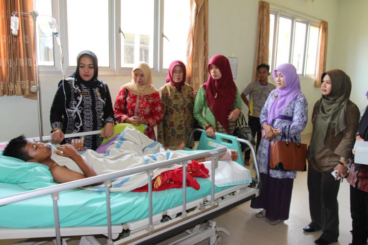 Ny Tirah Satriani (kiri) isti wabup didampingi pengurus PKK saat menjenguk korban kecelakaan dari anak Panti Asuhan Istiqomah di RSU Kudungga. ©2016 Merdeka.com