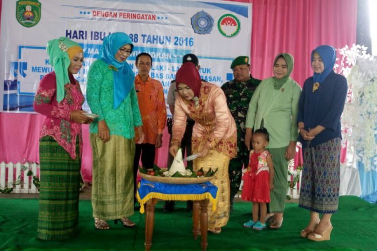 Ketua PKK Kecamatan Muara Ancalong Hj Ita Sufianti memotong tumpeng sebagai tanda peringatan Hari Ibu pada Kamis (22/12/2016) lalu bersama kaum hawa lainnya. ©2016 Merdeka.com