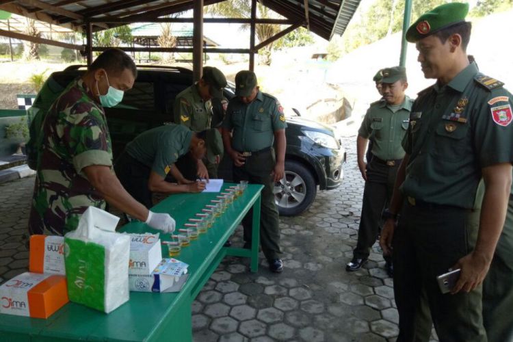 Petugas saat melakukan tes urine bagi anggota Kodim 0909/Sangatta, guna mengetahui apakah ada yang mengkonsumsi narkoba atau tidak. ©2016 Merdeka.com
