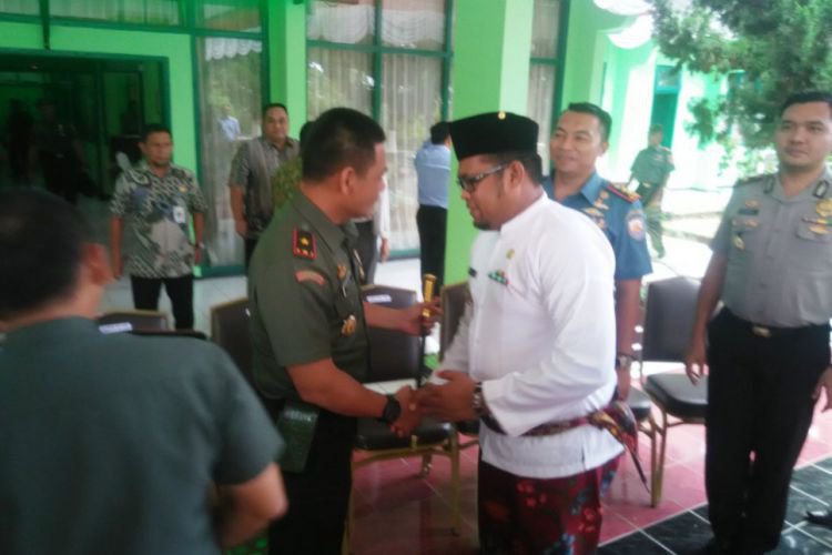 Wabup Kasmidi Bulang menyambut kedatangan Danrem 091/ASN Brigjen TNI Irham Waroiham ketika tiba di Makodim 0909/Sangatta. ©2017 Merdeka.com
