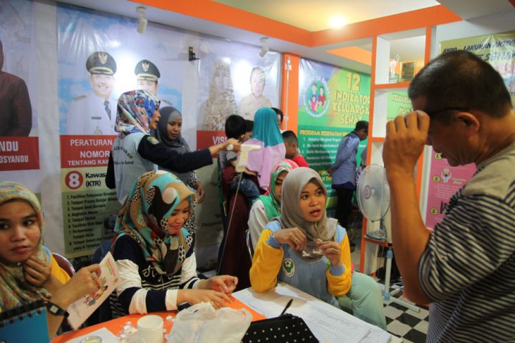 Pertugas stan Dinas Kesehatan dengan ramah memberikan pelayanan kepada masyarakat yang ingin memeriksakan kesehatan secara gratis di PRK Expo HUT Kutim. ©2016 Merdeka.com