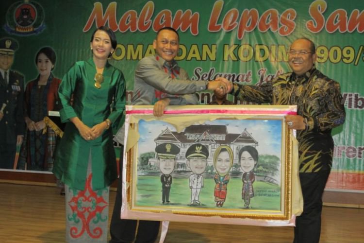 Bupati Kutim Ismunandar menyerahkan cinderamata kepada Letkol Inf Setyo Wibowo saat malam lepas sambut dandim baru Letkol Inf Kamil Bahren. ©2017 Merdeka.com