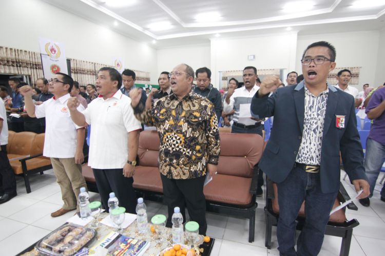 Bupati Ismunandar, Ketua DPRD Kutim Mahyunadi, Waketum KONI Kaltim Rusdiansyah Aras dan pengurus cabang olahraga yang hadir dalam Musorkablub KONI Kutim, Kamis (22/12/2016) malam di gedung Balai Pertemuan Umum kecamatan Sangatta Utara. ©2016 Merdeka.com