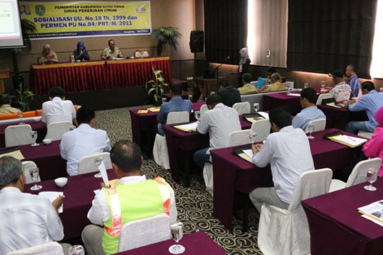 Merdeka.com, Kutai Timur - Untuk memberikan arah pertumbuhan bagi pelaku jasa kontruksi guna mewujudkan struktur usaha yang kokoh, handal, serta berdaya saing tinggi dengan hasil pekerjaan berkualitas, Dinas Pekerjaan Umum (DPU) Kabupaten Kutai Timur (Kutim) mensosialisasikan Undang-Undang (UU) Nomor 18 Tahun 1999 tetang Jasa Kontruksi dan Peraturan Menteri Pekerjaan Umum (Permen PU), terkait pedoman persyaratan pemberian Ijin Usaha Jasa Kontruksi (IUJK) Nasional. Sosialisasi diselenggarakan di Hotel Royal Victoria, Sangatta, belum lama ini.