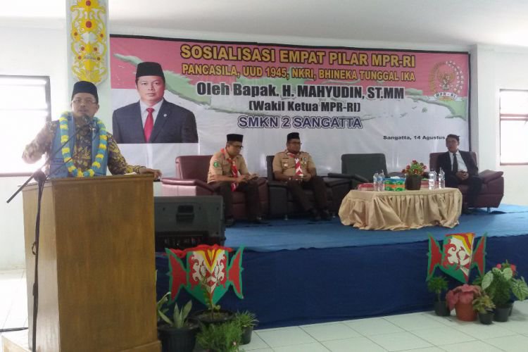 Ratusan siswa dan siswi SMK N 2 Sangatta tampak serius mendengarkan paparan Mahyudin selaku pembicara. Mengawali sosialisasinya, Mahyudin menceritakan sejarah singkat perjalanan hidupnya selama di Kabupaten Kutim yang penuh dengan perjuangan hingga bisa menjadi orang nomor dua di MPR RI.