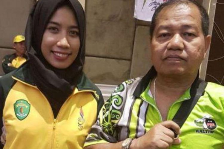 Ayu dan Ketua Anggar Kutai Timur Johansyah Ibrahim, usai menerima medali emas PON di Bandung. ©2016 Merdeka.com