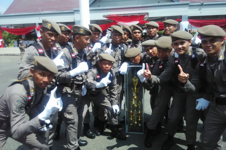 Satpol PP Kutim saat meraih juara pada perlombaan HUT Satpol PP se-Kaltim dan usai menerima piala narsis sebentar sebagai kenangan. ©2016 Merdeka.com