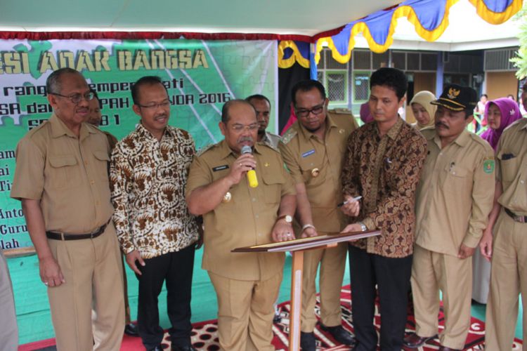 Bupati ismunandar dan Wabup Kasmidi Bulang saat meresmikan SD YPPSB 1 sebagai sekolah berbudaya literasi digital pertama di Kutim didampingi Kadisibud Iman Hidayat dan pimpinan sekolah tersebut. ©2016 Merdeka.com