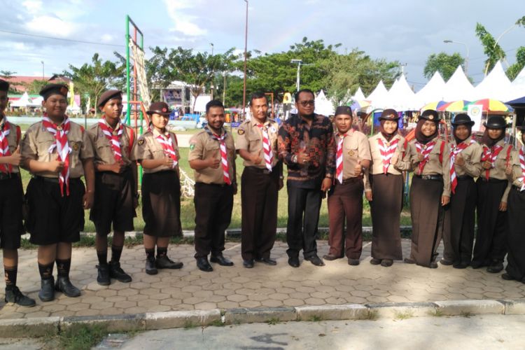 Wabup Kasmidi yang juga Ketua Kwarcab Pramuka Kutim berfoto bersama anggota pramuka dan pendamping yang akan bertola ke Malaysia. ©2016 Merdeka.com