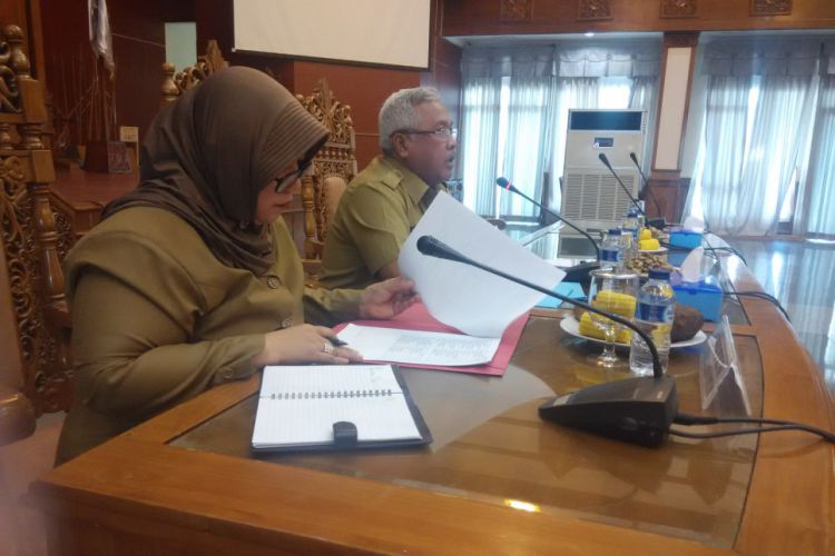 Asisten Administrasi Umum Hj Yulianti saat mendampingi Sekkab Irawansyah rapat koordinasi meminta kepada semua SKPD segera menyampaikan laporan keuangan tahun 2016. ©2017 Merdeka.com