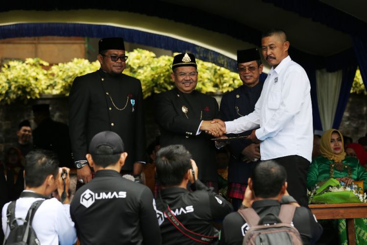 Bupati Ismunandar didampingi Wabup Kasmidi menyerahkan sertifikat lahan kepada perwakilan warga transmigrasi, saat peringatan HUT ke-17 Kutin, Rabu (12/10) lalu. ©2016 Merdeka.com