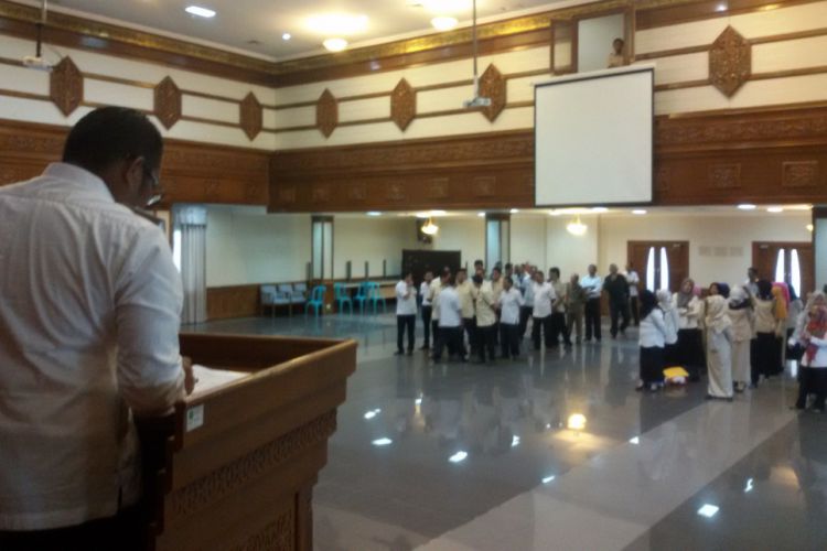 Wabup Kasmidi Bulang saat memberikan pengarahan kepada pegawai yang tercatat tak masuk pada hari pertama kerja tahun 2017 lalu. ©2017 Merdeka.com