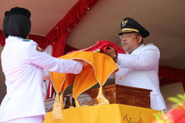 Bupati Ismunandar menyerahkan bendera pusaka merah putih kepada salah satu anggota Paskibraka untuk dikibarkan pada peringatan detik-detik Prokalamasi kemerdekaan ke 71 tahun 2016. ©2016 Merdeka.com
