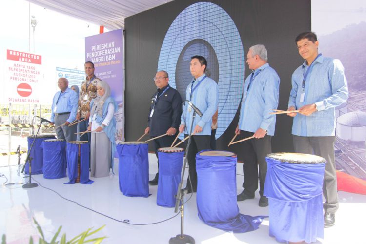 Bupati Ismunandar dan jajaran manajemen PT PSE menabuh gendang, sebagai tanda diresmikannya tanki timbun BBM yang berada di kawasan tambang KPC. ©2017 Merdeka.com