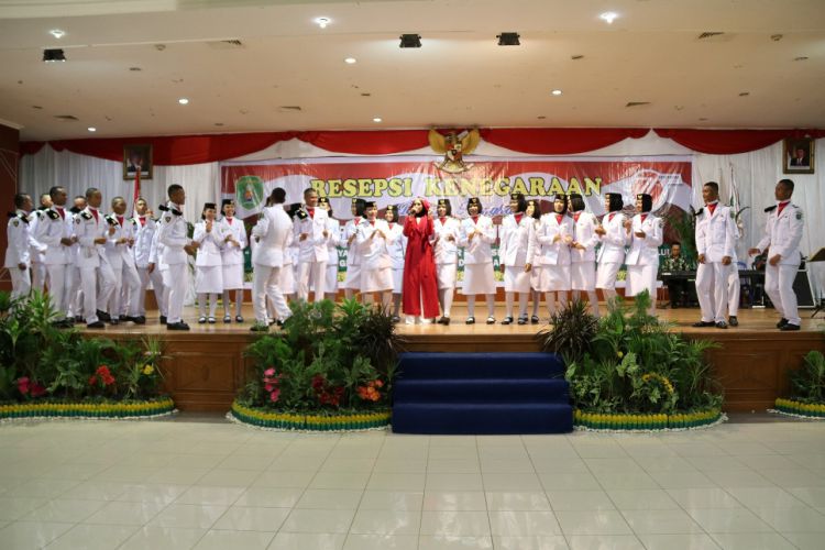Anggota Paskibraka sedang bernyanyi bersama di atas panggung saat resepsi kenegaraan. ©2016 Merdeka.com