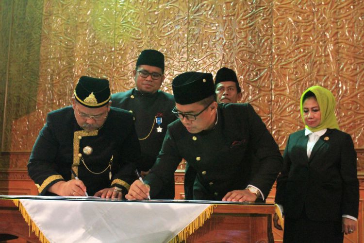 Bupati Ismunandar dan Ketua DPRD Mahyunadi menandatangani KUA-PPAS 2017 disaksikan Wabup Kasmidi Bulang dan dua wakil ketua DPRD Kutim Yulianus Palangiran dan Encek UR Firgasih. ©2016 Merdeka.com