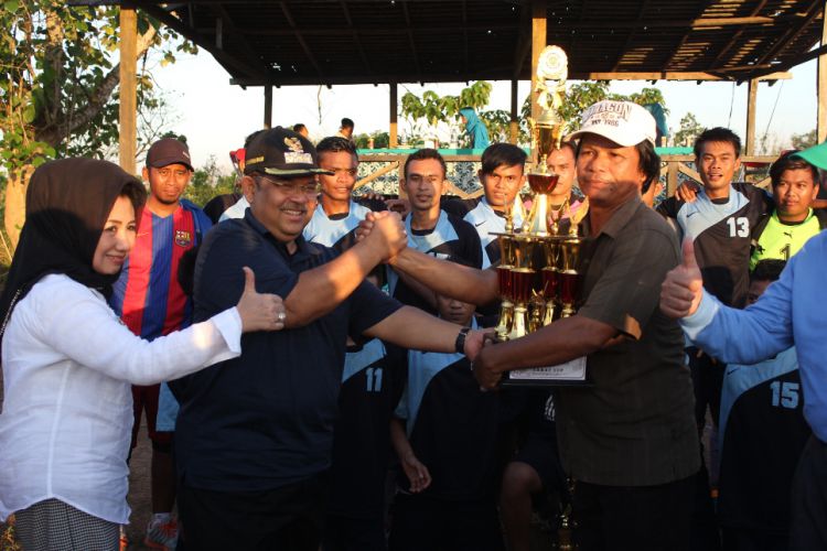 Bupati Ismunandar didampingi istri Encek UR Firgasih ketika menyerahkan piala kepada juara turnamen sepakbola 'Camat Rantau Pulung Cup' tahun 2016 di kecamatan Rantau Pulung. ©2016 Merdeka.com