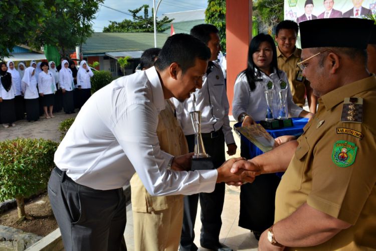 Bupati Ismunandar menyerahkan hadiah kepada pemenang lomba peringatan Hari Amal Bhakti , Selasa (3/1/2017) di kantor Kemenag Kutim, usap apel upacara. ©2017 Merdeka.com