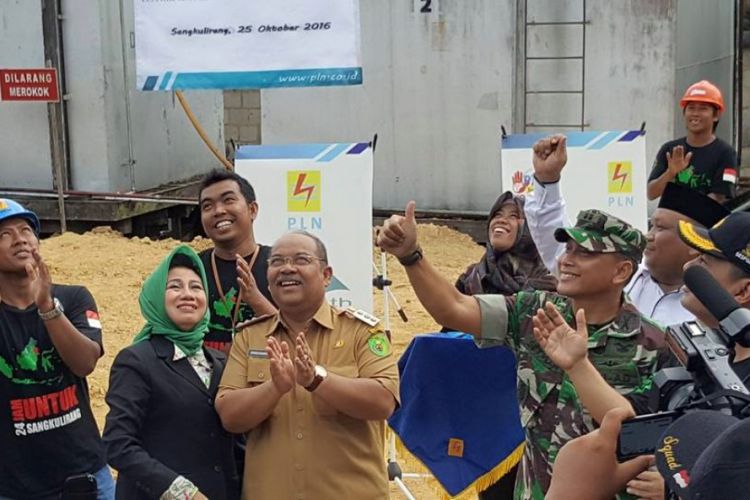 Bupati Ismunandar didampingi istri Ny Encek UR Firgasih dan Dandim 0909 Sangatta Letkol Inf Setyo Wibowo, saat meresmikan listrik 24 di kecamatan Sangkulirang. ©2016 Merdeka.com