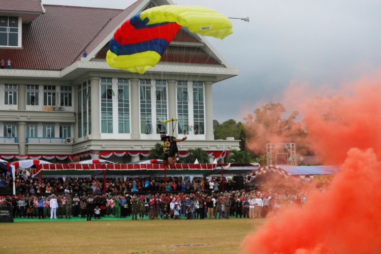 Aksi terjun payung menyita perhatian ribuan warga Sangatta yang memadati area lapangan, deretan parasut dari arah langit sudah mulai tampak.