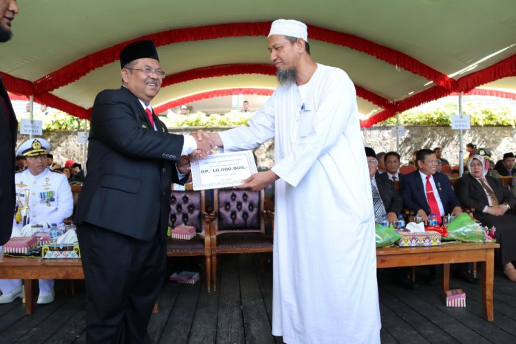 Bupati Kutim Ismunandar menyerahkan bantuan untuk korban kebakaran secara simbolis yang diwakili Anas, seorang warga desa Teluk Lingga yang rumahnya terbakar. ©2017 Merdeka.com