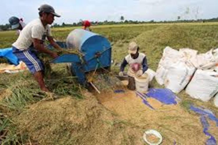 Petani di Kutim saat melakukan panen dengan menggunakan mesin perontok padi, namun pengeringnya masih menggunakan secara manual. ©2016 Merdeka.com