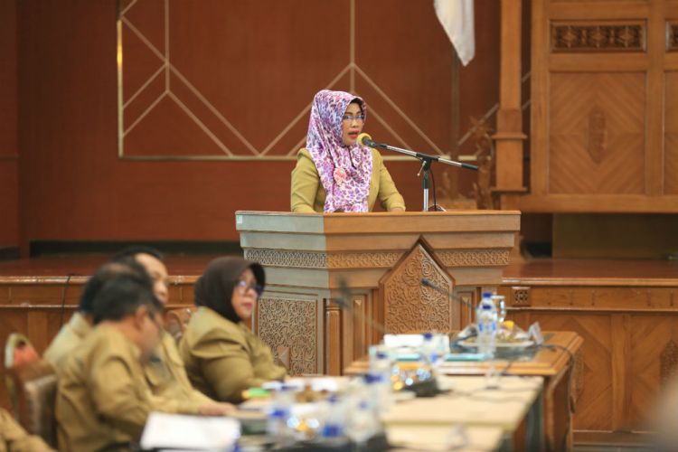 Dalam agenda rapat coffee morning, tim pembina bank sampah yang diketuai Heni Afriah berkesempatan mempresentasikan laporan tentang kebijakan Nasional tentang Bank Sampah Induk, inventarisasi dan presentase Bank Sampah di Ruang Meranti, Kantor Bupati, Senin (15/5).