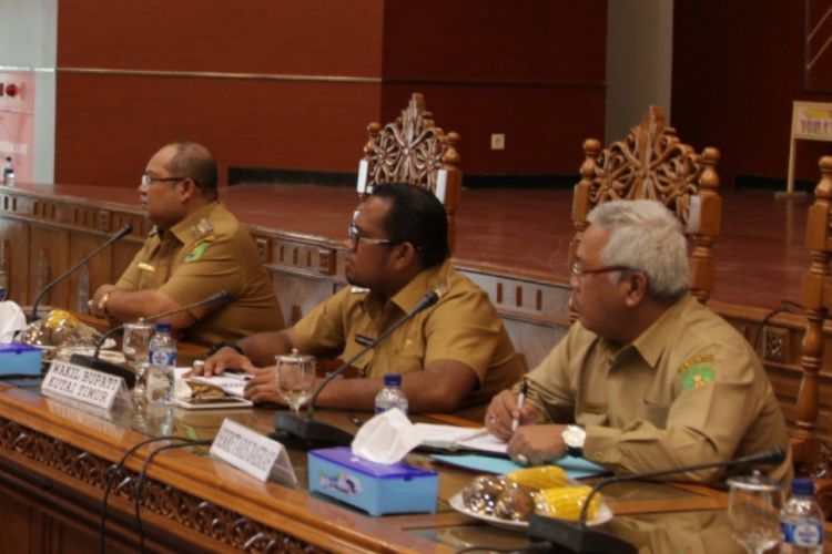 Bupati Ismunandar, Wabup Kasmidi Bulang dan Sekkab Irawansyah saat memimpin rapat koordinasi 'Coffee morning' di ruang Meranti, salah satunya membahas soal pendistribusian pegawai ke OPD yang baru. ©2017 Merdeka.com