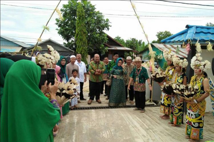 Ismunandar yang mengenakan baju batik dengan dominan warna hijau dan bunda Encek mengenakan batik warga hijau tua dengan kerudung langsung disambut warga dengan antusias. Sebagian warga menyambutnya dengan adat Dayak.