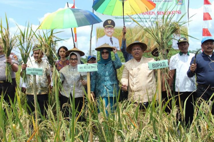 Bupati Ismunandar, Wakil Ketua DPRD Hj Encek UR Firgasih, Camat Kaubun M Amin dan sejumlah pejabat dan petani, saat panen padi di desa Kadungan Jaya, kecamatan Kaubun, Kutai Timur. ©2017 Merdeka.com