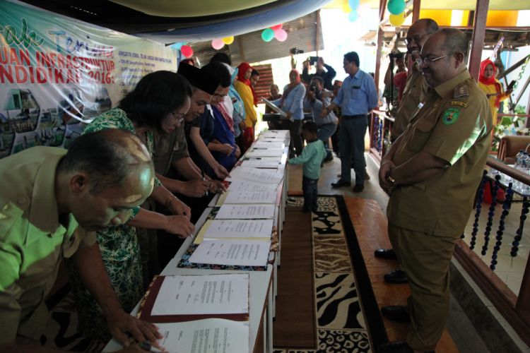 Bupati Ismunandar didampingi Kadisdikbud Iman Hidayat menyaksikan penandatanganan serahterima sekolah dari PT Kaltim Prima Coal (KPC). ©2016 Merdeka.com