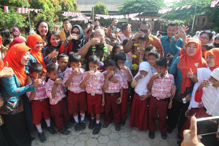 Bupati Ismunandar dan Wabup Kasmidi Bulang bersama pelajar SD ketika melakukan gerakan minum susu bersama. ©2016 Merdeka.com