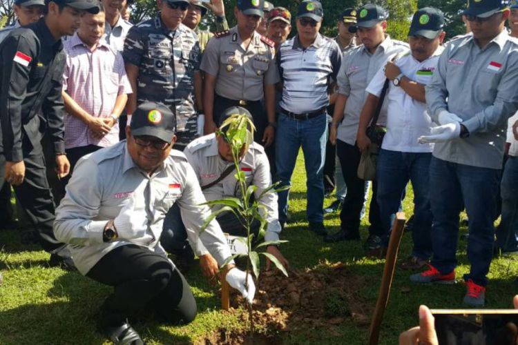 Wabup Kasmidi Bulang menanam pohon mangga di kawasan RSUD Kudungga berkiatan memperingati hari buruh sedunia tadi pagi disaksikan sejumlah pejabat dan buruh. ©2017 Merdeka.com