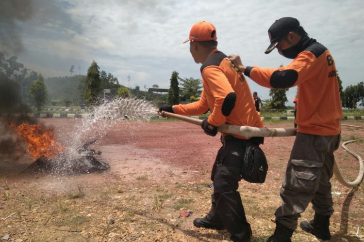 Petugas BPBD Kutim melakukan simulasi untuk mengatasi bencana kebakaran saat peringatan kesiapsiagaan di Kutim. ©2017 Merdeka.com