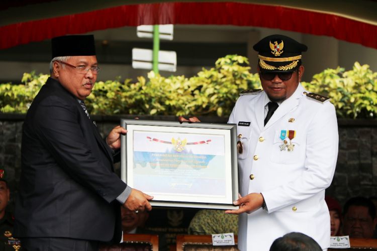 Sekkab Kutim Irawansyah menyerahkan penghargaan secara simbolis kepada Wabup Kasmidi Bulang mengenai laporan keuangan dari Kemenkeu. ©2017 Merdeka.com