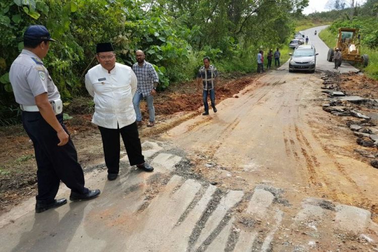 Bupati Ismunandar langsung meninjau ke lokasi, begitu mendengar adanya jalan poros trans Kaltim yang longsor di km 12 Desa Sepaso Selatan, kecamatan Bengalon dan kini sudah kembali normal setelah diperbaiki. ©2017 Merdeka.com