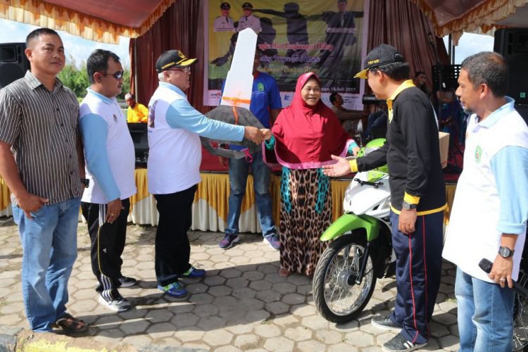 Seskab Irawansyah menyerahkan hadiah kepada peserta jalan santai didampingi Kepala Badan Lingkungan Ence Rafiddin Rizal dan pejabat lainnya. ©2017 Merdeka.com