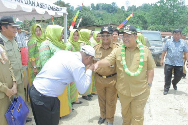 Bupati Kutim Ismunandar disambut masyarakat ketika tiba di kecamatan Batu Ampar, Kutai Timur untuk melakiukan kunjungan kerja di pedalaman. ©2017 Merdeka.com