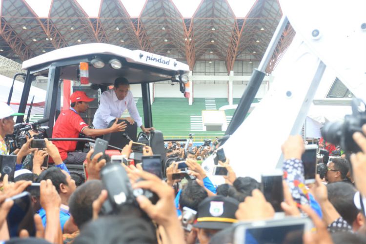 Merdeka.com, Kutai Timur - Usai membuka Pekan Nasional (Penas) Kontak Tani Nelayan Andalan (KTNA) XV/2017 di Stadion Harapan Bangsa Lhoong Raya, Sabtu (6/5), Presiden Joko Widodo meninjau tiga alat mesin pertanian (Alsintan) produksi PT Pindad (Persero). Tipe Alsintan produksi Pindad yang dipamerkan di area stadion salah satunya yaitu Pengolah Tanah Amphibi PA-1800, alat ini memiliki fungsi mengolah tanah sekaligus mencacah sisa jerami padi, jagung, dan gulma serta mencampur dengan tanah, sehingga akan meningkatkan kandungan bahan organik tanah.