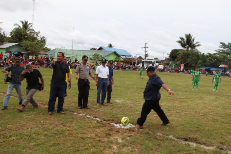 Bupati Ismnandar melakukan tendangan bola pertama sebagai tanda dimulainya turnamen KWS CUP di Sangkulirang. ©2017 Merdeka.com