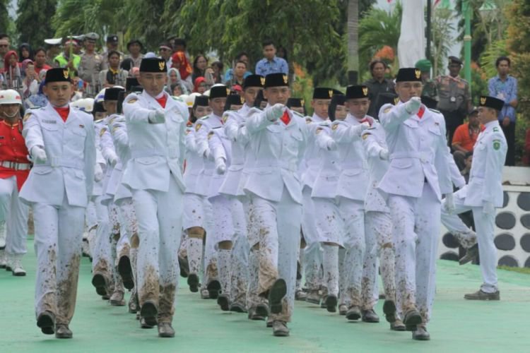 Meski sepatu dan celana maupun rok kotor, namun tak menyurutkan semangat untuk menjalankan tugas bagi Paskibraka Kutim saat menaikkan sang merah putih pada upacara HUT ke-72 RI di halaman kantor bupati, Kamis (17/8) tadi pagi. ©2017 Merdeka.com