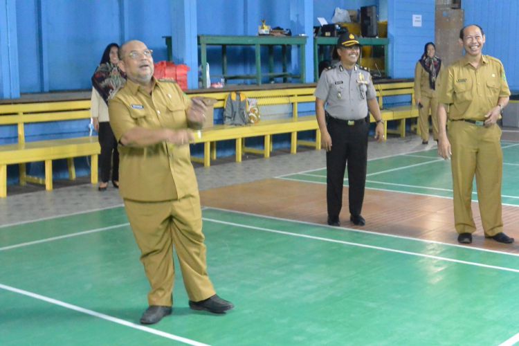 Bupati Ismunandar mencoba raket untuk memukul pertama kerjuaraan bulutangkis Disporapar. ©2016 Merdeka.com
