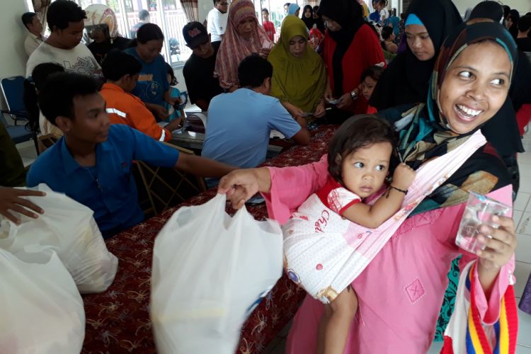 Meski menggendong anak, namun seorang ibu ini rela antre untuk memperoleh paket sembako murah yang disalurkan PT Pama di gedung BPU kecamatan Sangatta Utara. ©2017 Merdeka.com