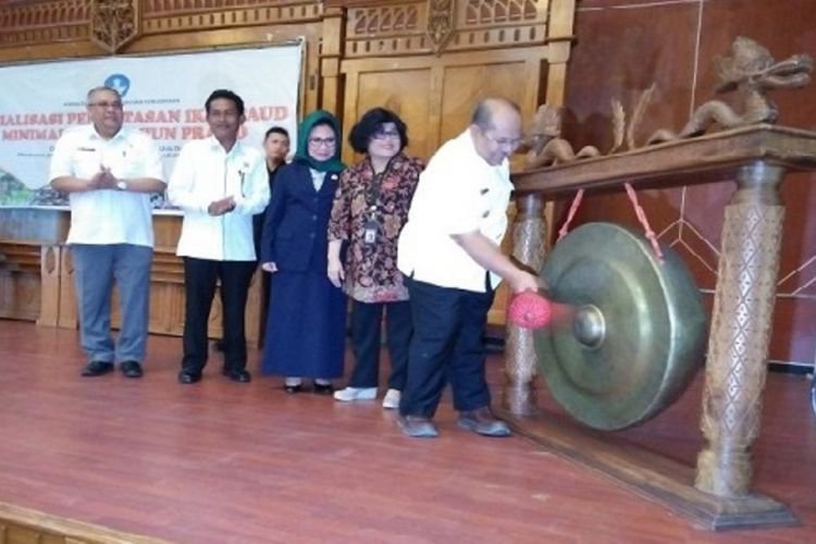 Bupati Kutim Ismunandar ketika membuka sosialisasi PAUD stau tahun dengan memukul gong disaksikan direktur PAUD, bunda PAUD dan Kadis Pendidikan serta Wakil ketua DPRD Kutim. ©2017 Merdeka.com