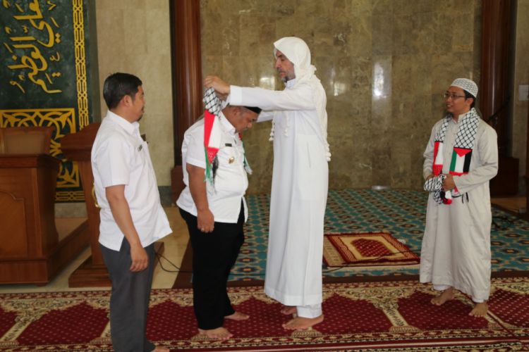 Bupati Kutim Ismunandar mendapat kalung sall dari Syeikh Muhammad Bin Thaer Al Maqdisi dari Palestina di masjid Agung. ©2017 Merdeka.com